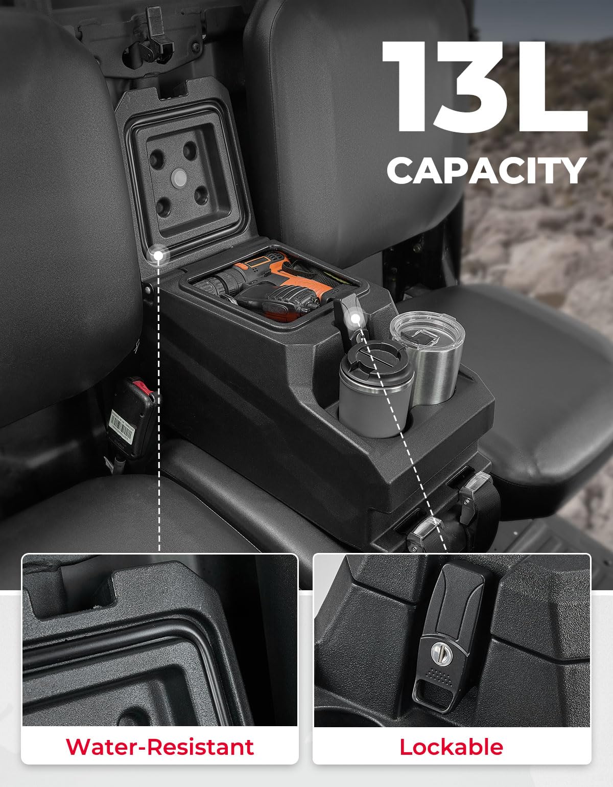This seat box provide 13L capacity. Open the UTV center console box, you can see the lid sealed with waterproof tape, keeping clean and dry inside. Close the storage box, you can lock it by keys for anti-theft, making a secure storage space. In front of the UTV bench seat console, there are 2 cup holders, which fit most travel cups (φ8.5cm of the top, φ7cm of the bottom, 10cm height).