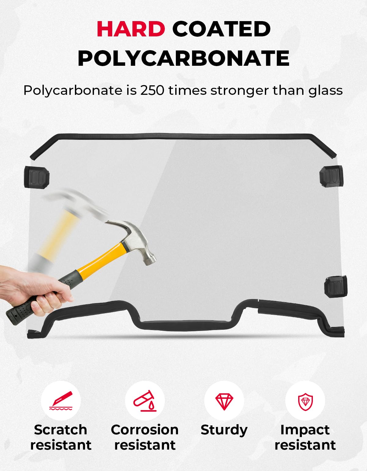 kemimoto windshield is accurately made according to UTV frames, thickened bottom rubber strips ensure tight connection with engine cover and does not scratch or damage the hood, preventing dust and water leakage.