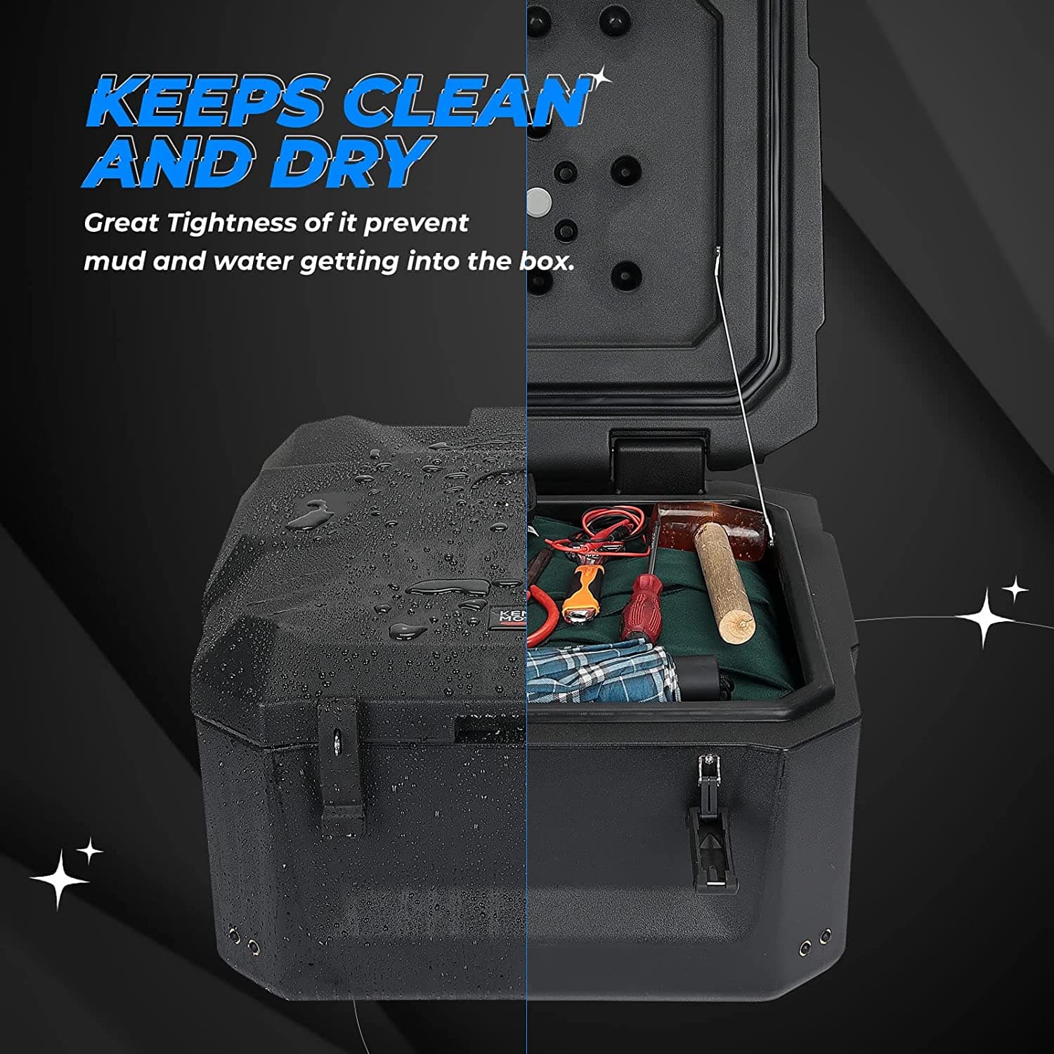 The cargo box is designed with good sealing performance, which prevents dust, mud, rain and snow getting into the box.So the box is helpful for you to keep things dry and organized.
