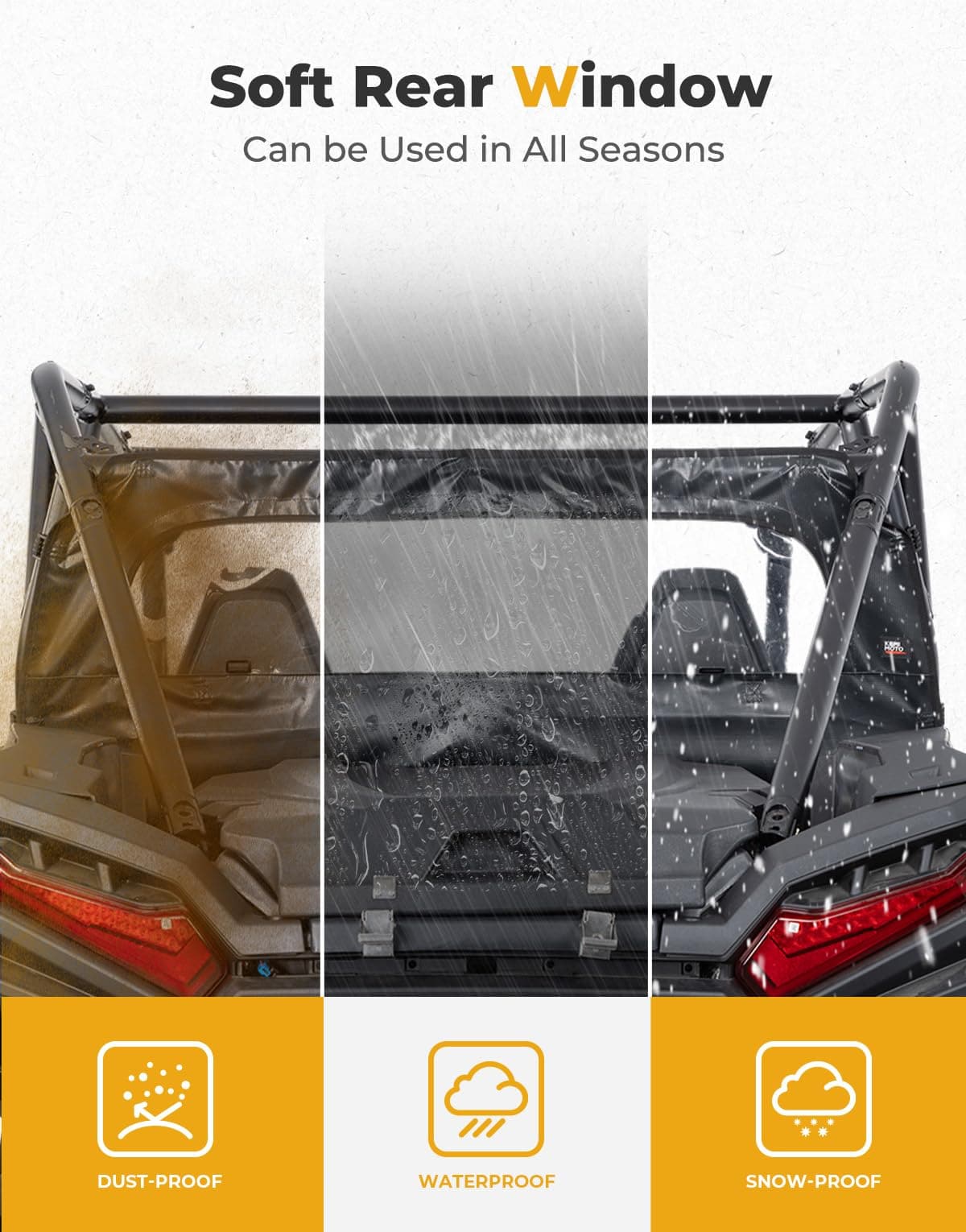 The soft rear window has decreased plenty of cold air, dirt, mud, snow, and debris entering the cab. To keep the UTV clean and tidy.