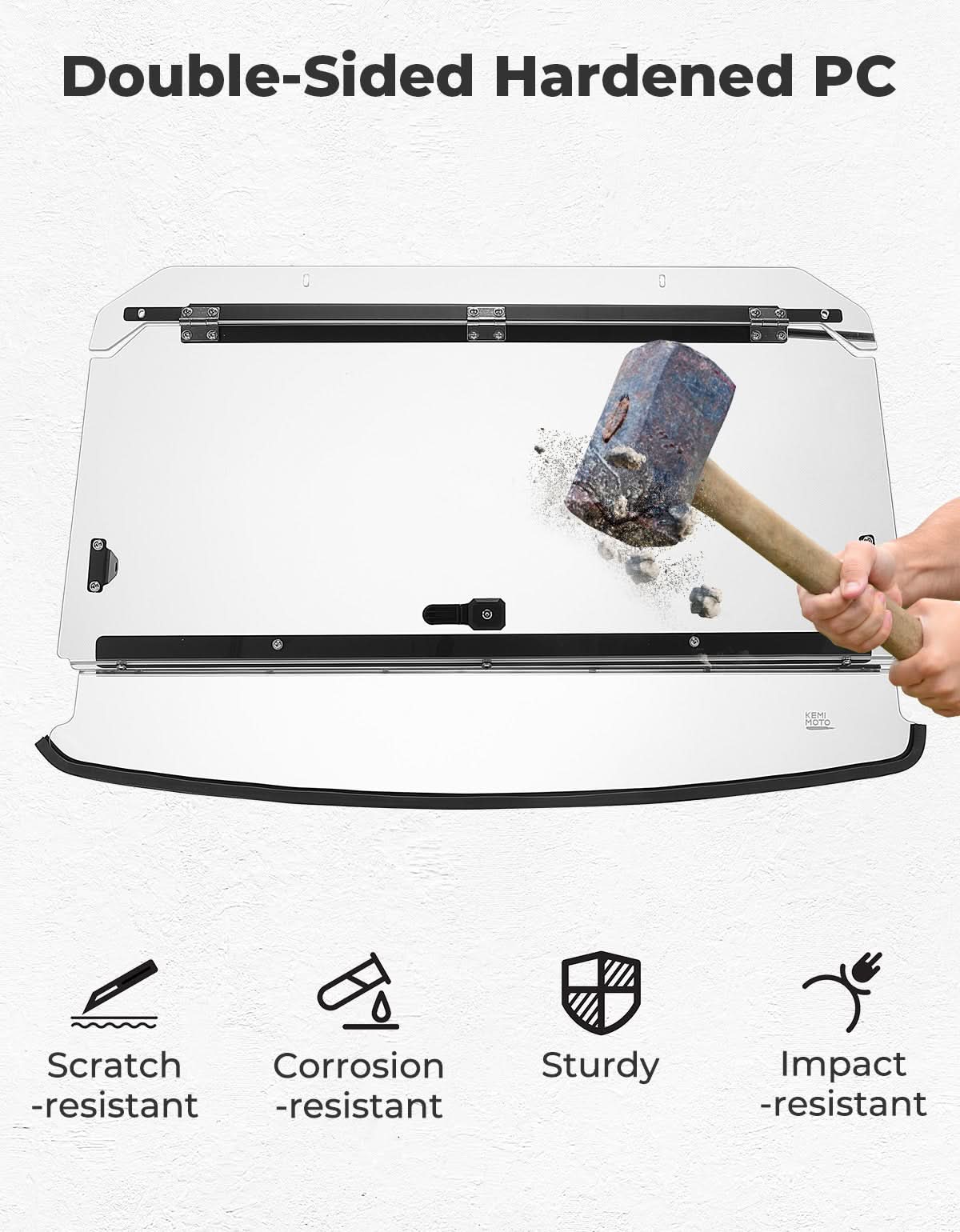This full flip windshield offers 93% light transmission, reducing glare while maintaining a clear view. If you want to avoid the cold wind that can make you uncomfortable in winter, now is the time to consider a KEMIMOTO UTV windshield.