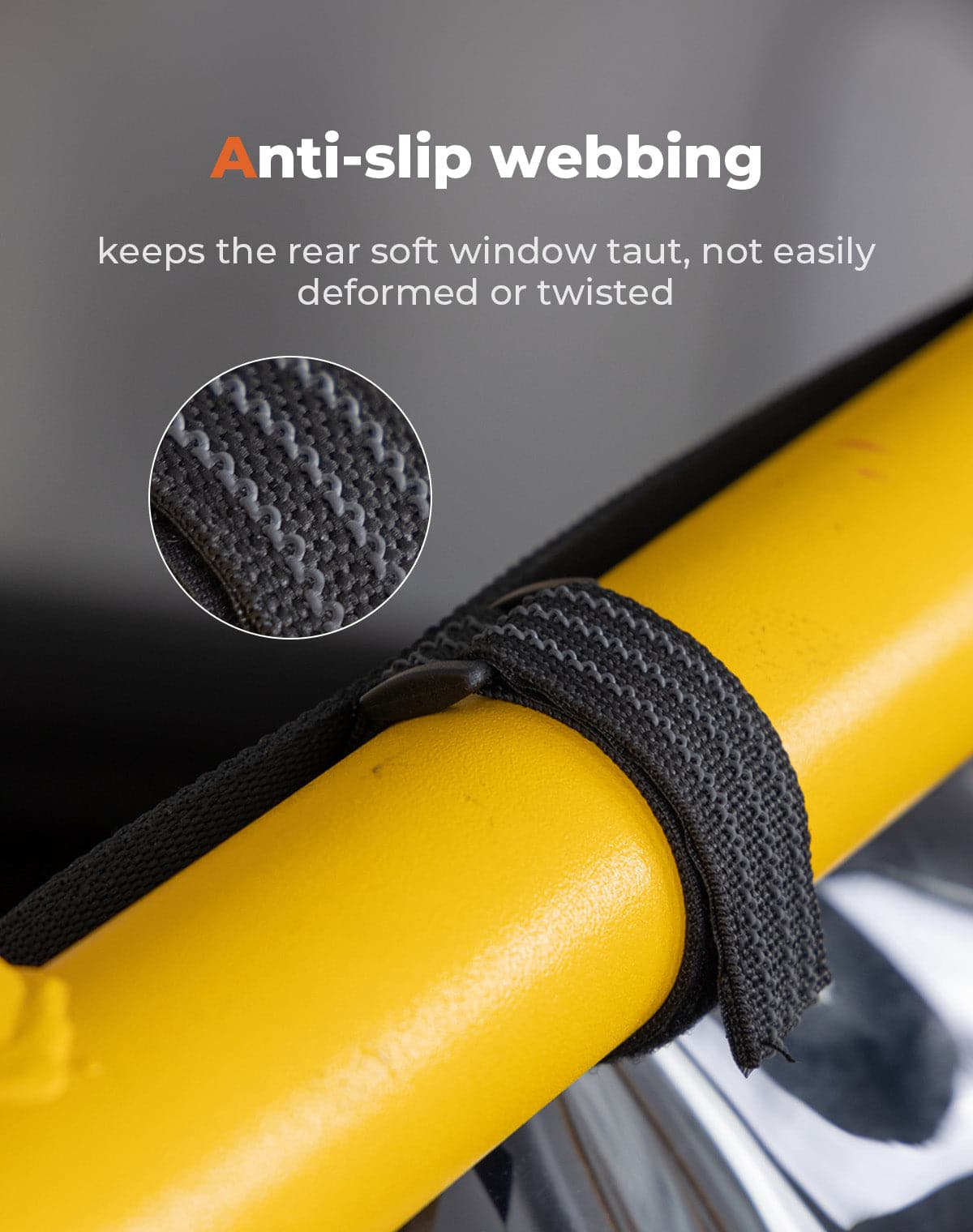 Equipped with anti-slip webbing, the rear soft window stays taut and does not easily deform or twist, maintaining its shape and effectiveness over time.