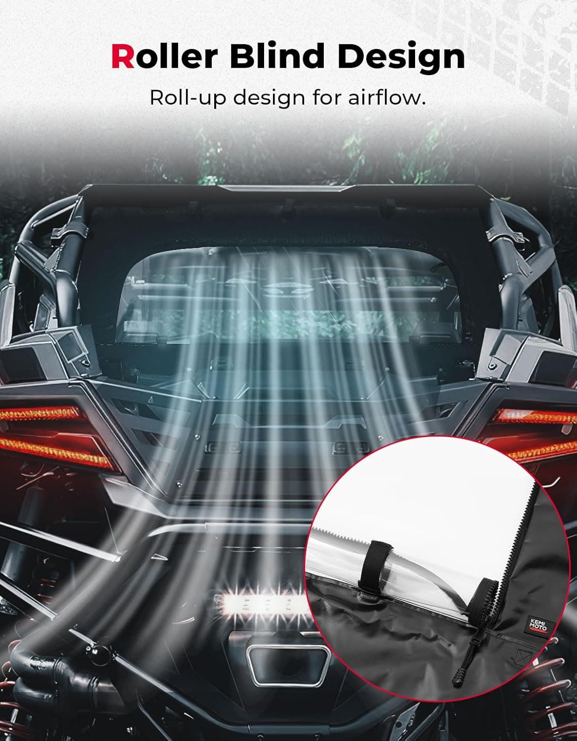 KEMIMOTO soft rear full windshield protect against harsh weather, keeps the cabin warm, reduces dust, and maintains interior cleanliness. When not in use, the clear film window can be zipped open and rolled up using the two straps to improve air circulation.