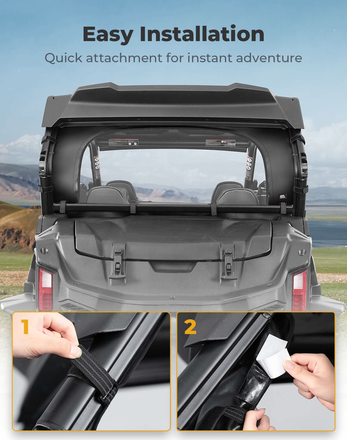 The ZForce 950 2023+ rear window can be quickly installed or removed, is easy to carry, and is ready to use right away. All you need to do is attach the hook and loop straps and adhere to the self-adhesive tape to complete the installation.