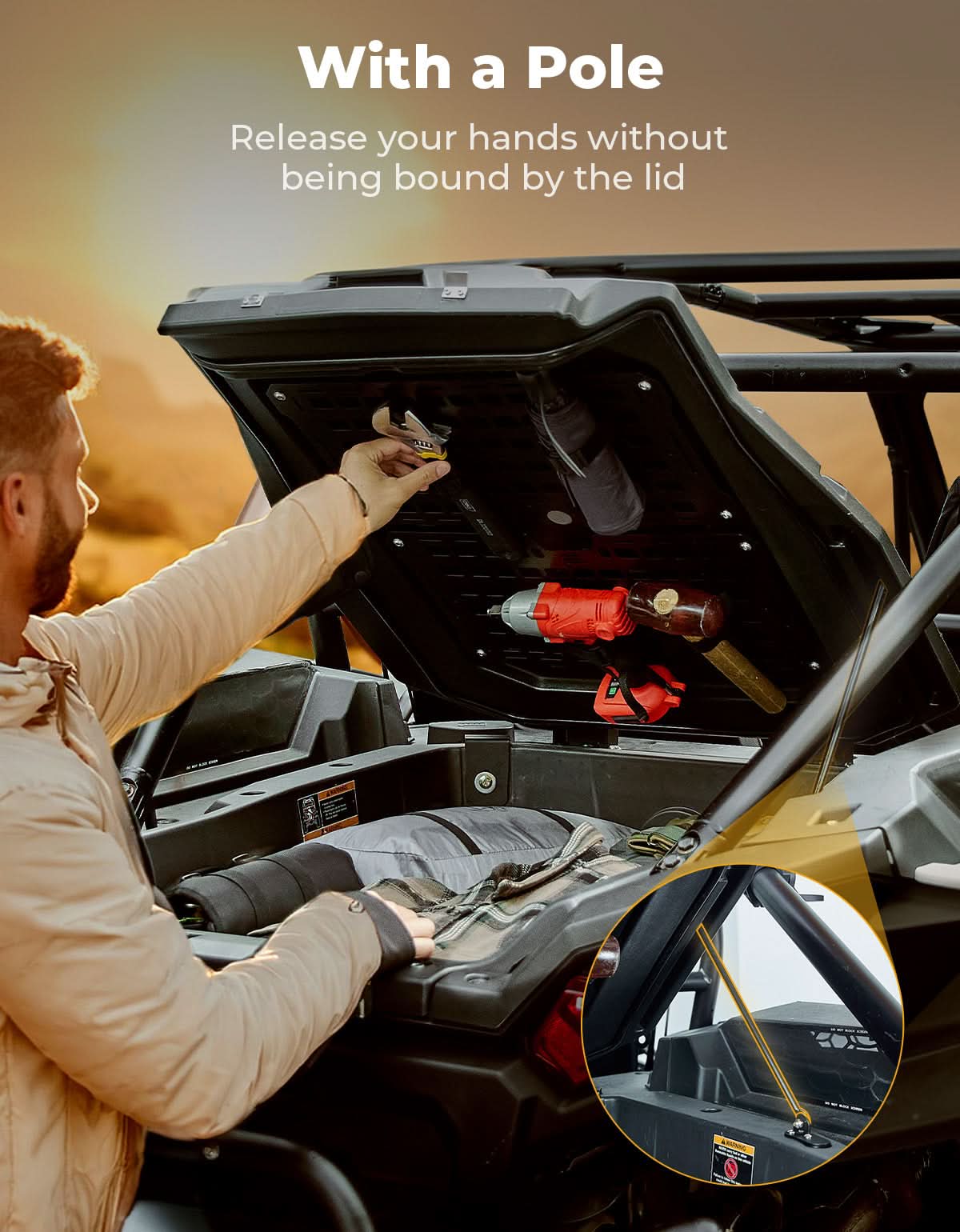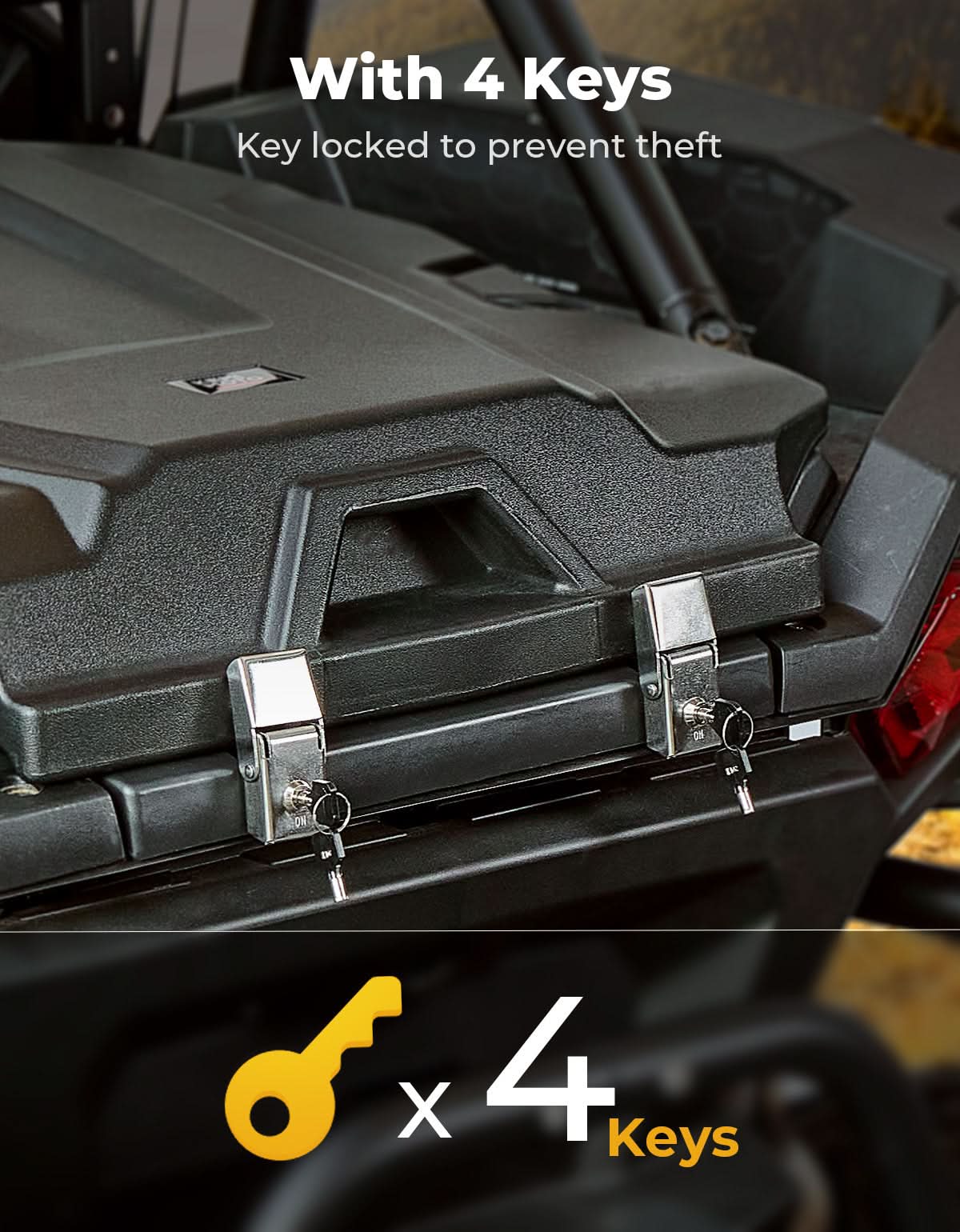 Our trunk bed enclosure guarantees your cargo remains safe regardless of the terrain. You can now securely store tools, accessories, and other items without worrying about them falling out of UTV.