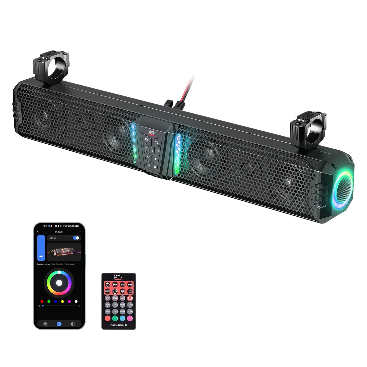 Music, Volume, Lights, and Power ¨C All in One App. Experience effortless BT5.3 pairing and reconnection, compatible with smartphones, MP3 players, tablets, computers, and more. The KEMIMOTO UTV Sound Bar also boasts USB input/output ports for flexible power delivery and device connectivity, plus a dedicated Party Mode that lets you link two speakers simultaneously¡ªexpanding sound coverage and elevating the atmosphere with vibrant, immersive audio