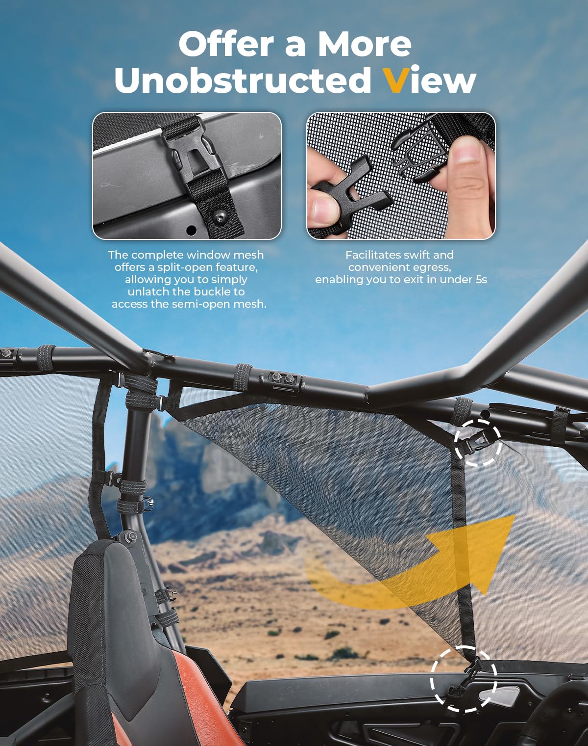The mesh screen UTV windows offers robust defense against outdoor elements such as pebbles and twigs, while also creating a barrier to keep pets securely inside during trail rides. Designed for optimal air circulation, it ensures the cabin remains well-ventilated even on warm days.